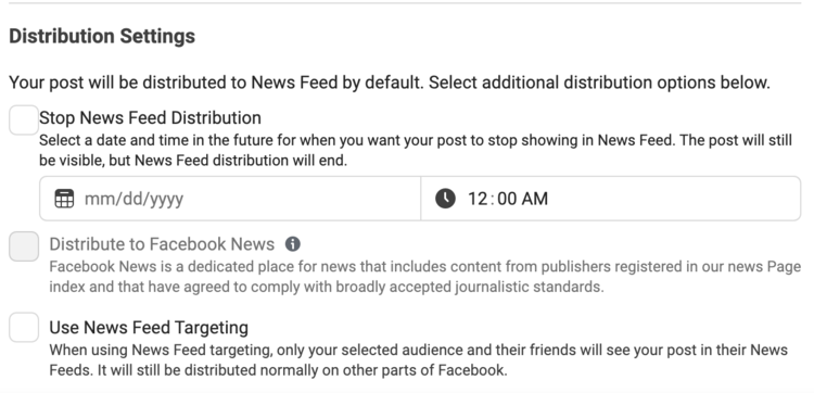 You can stop news feed distribution on any Facebook post in advance by amending the settings when you post. Within Creator Stdio, this is visible when creating a post, below where you put your caption and media so you just need to scroll down to see it.